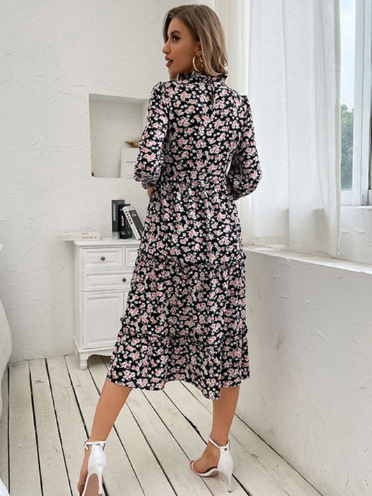 Women's fashion print lace-up waist-length sleeve dress