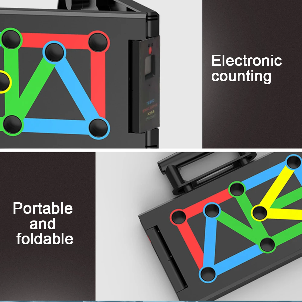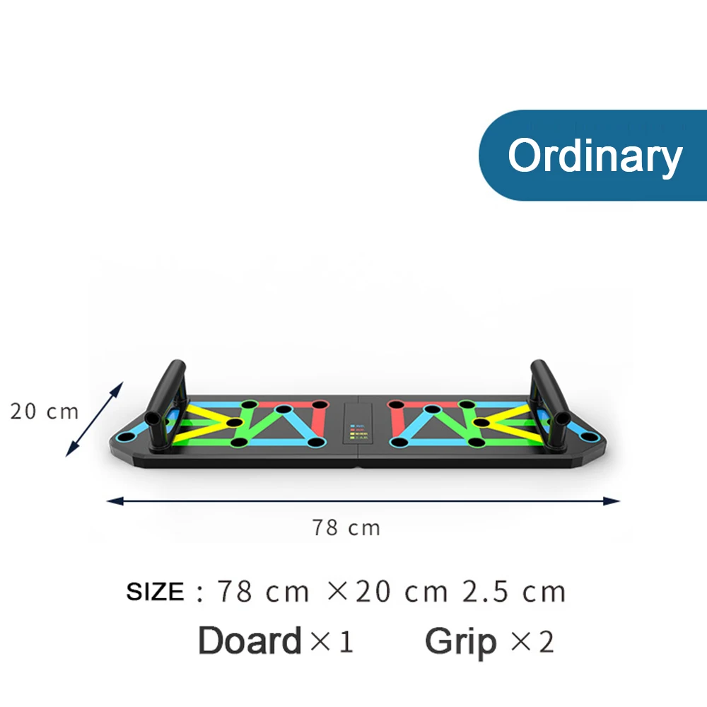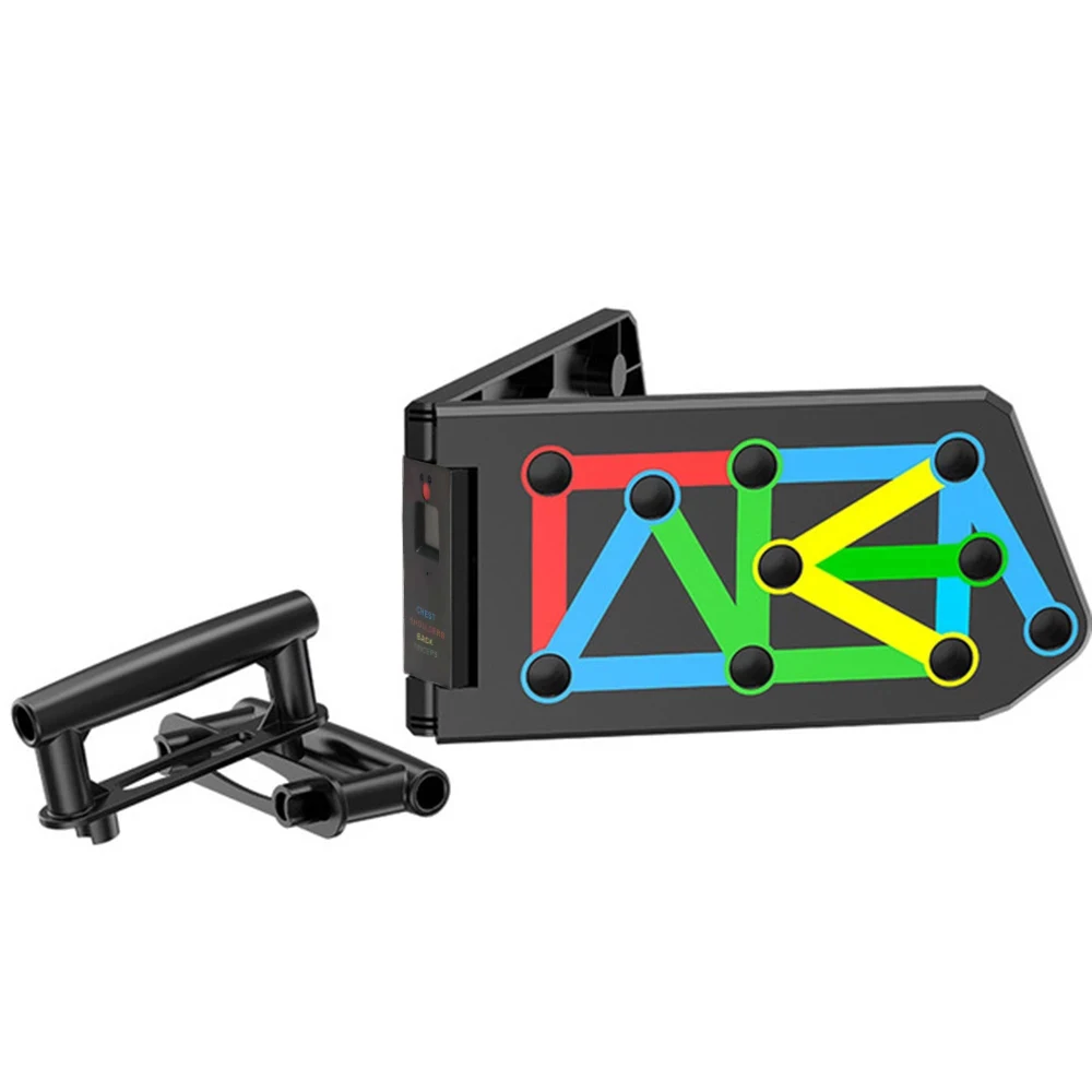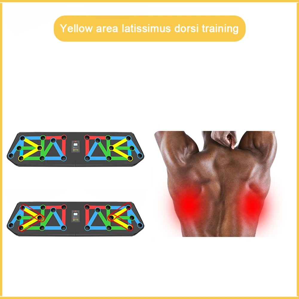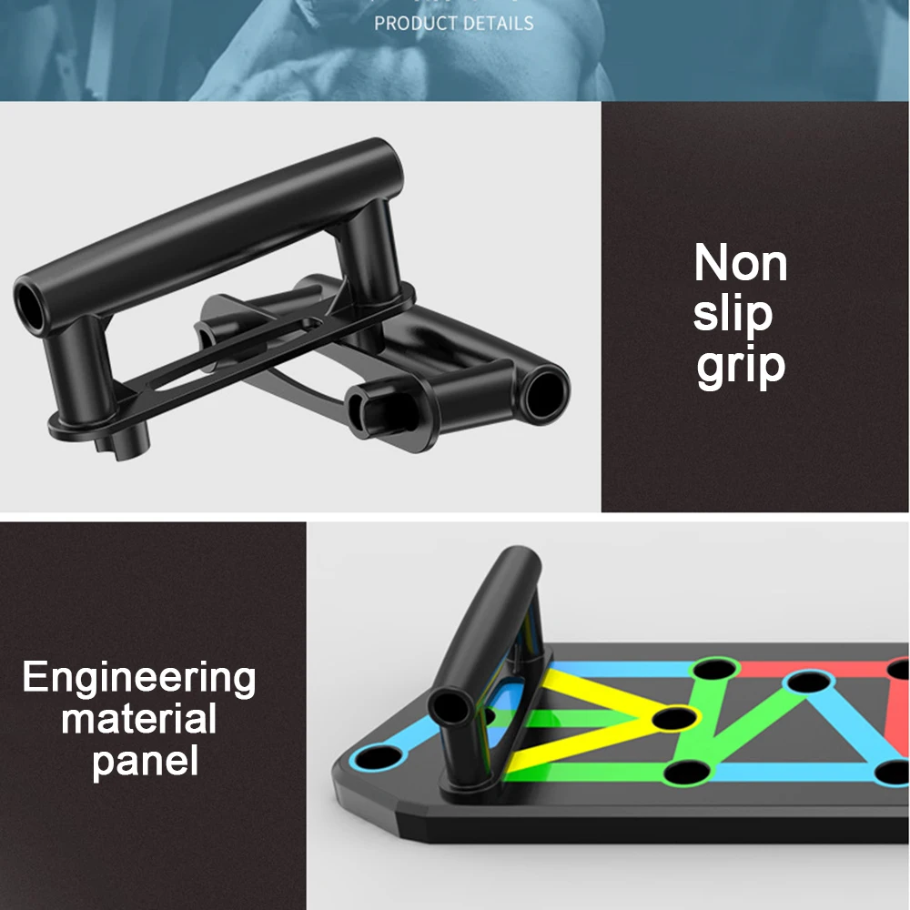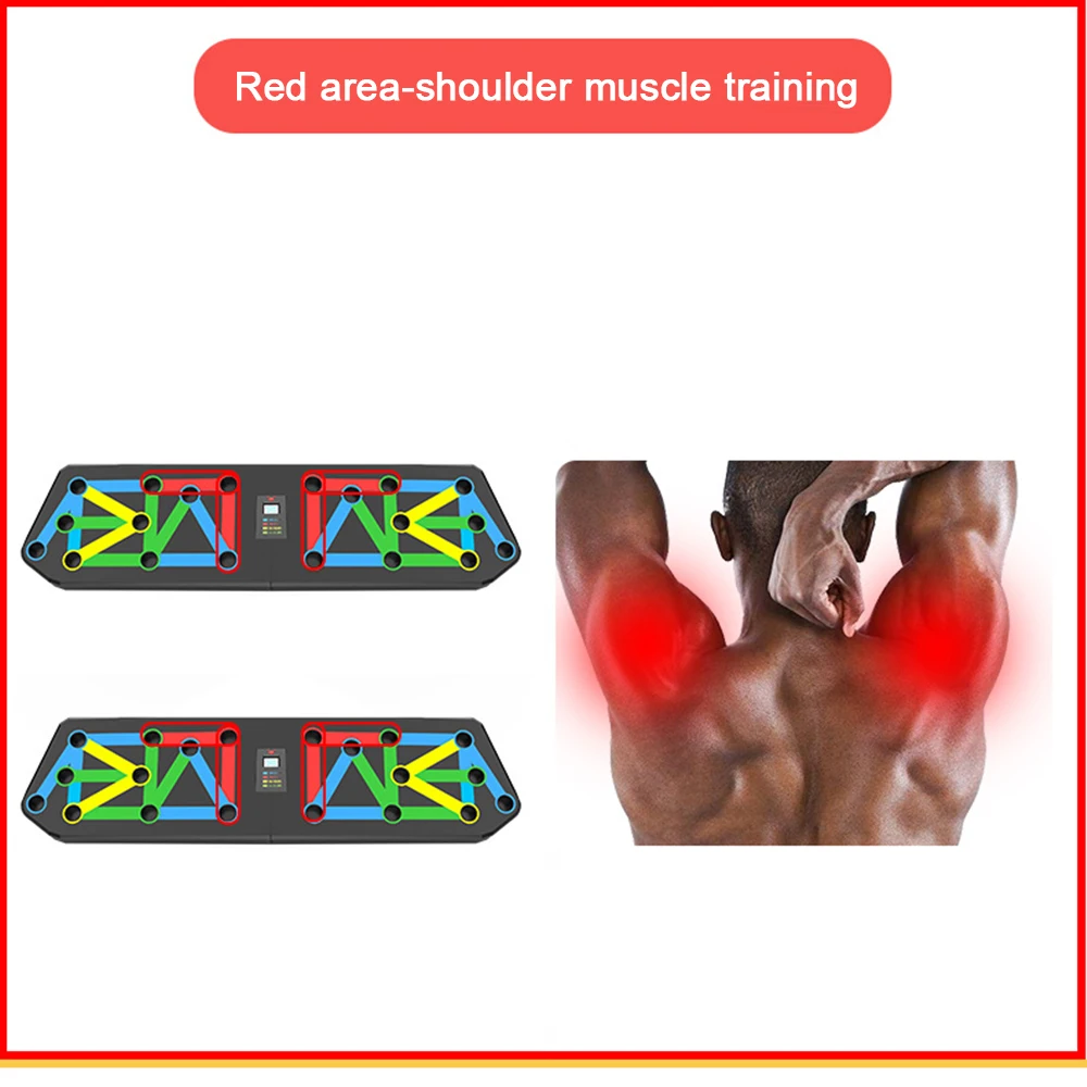 Multifunction Push Up Rack Board This Push Up Rack Board is a Comprehensive push up training system that color-coded. Different colors targets different exercise muscle part(Blue-chest, Red-shoulders, Yellow-back, and Green-triceps)