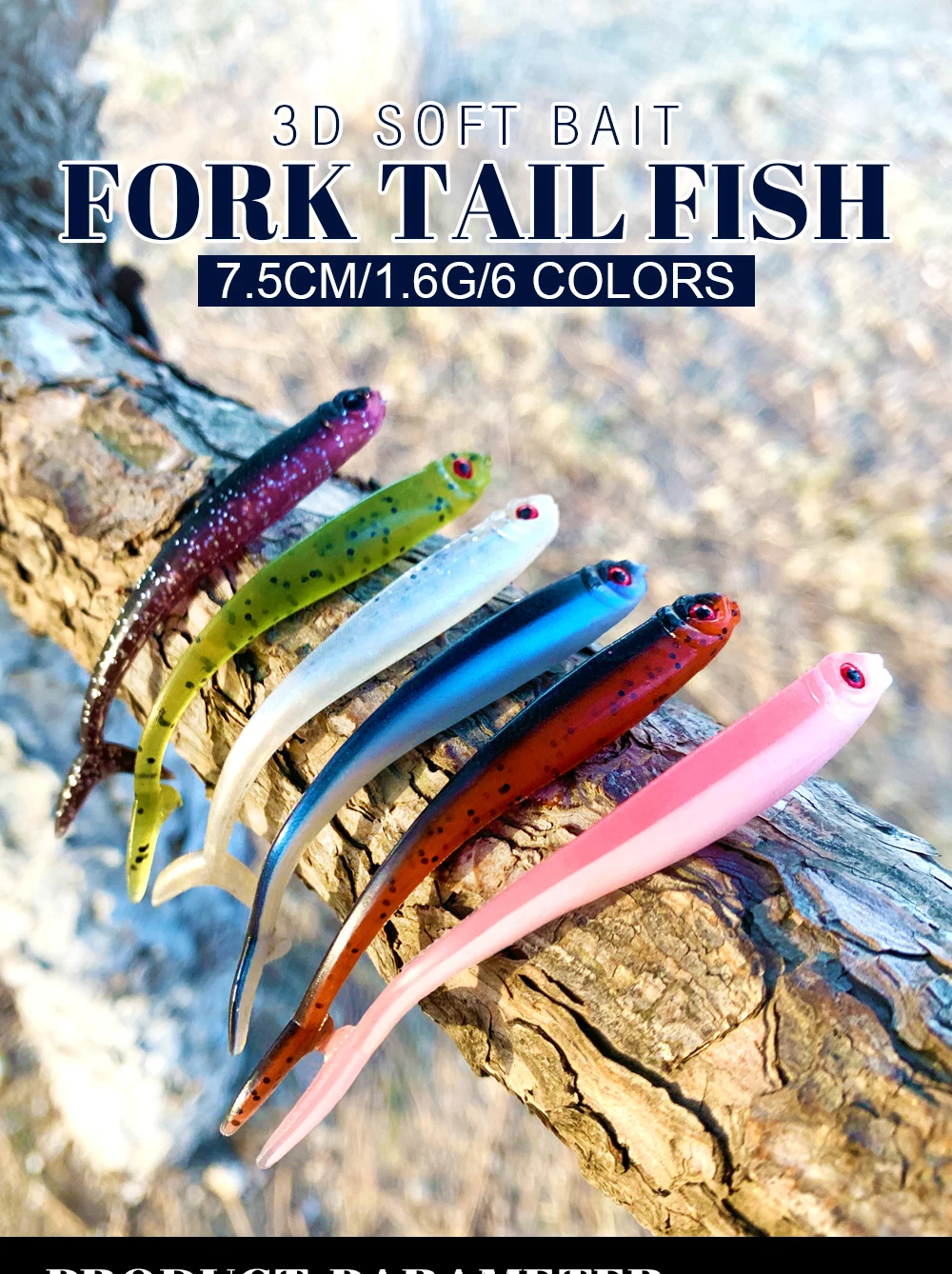 Spinpoler 20pcs Soft Fishing Lure Artificial Bait Fork Tail 75mm 1.6g Jerkbait Minnow Drop Shot Rubber Bait For Rigging And Jigging