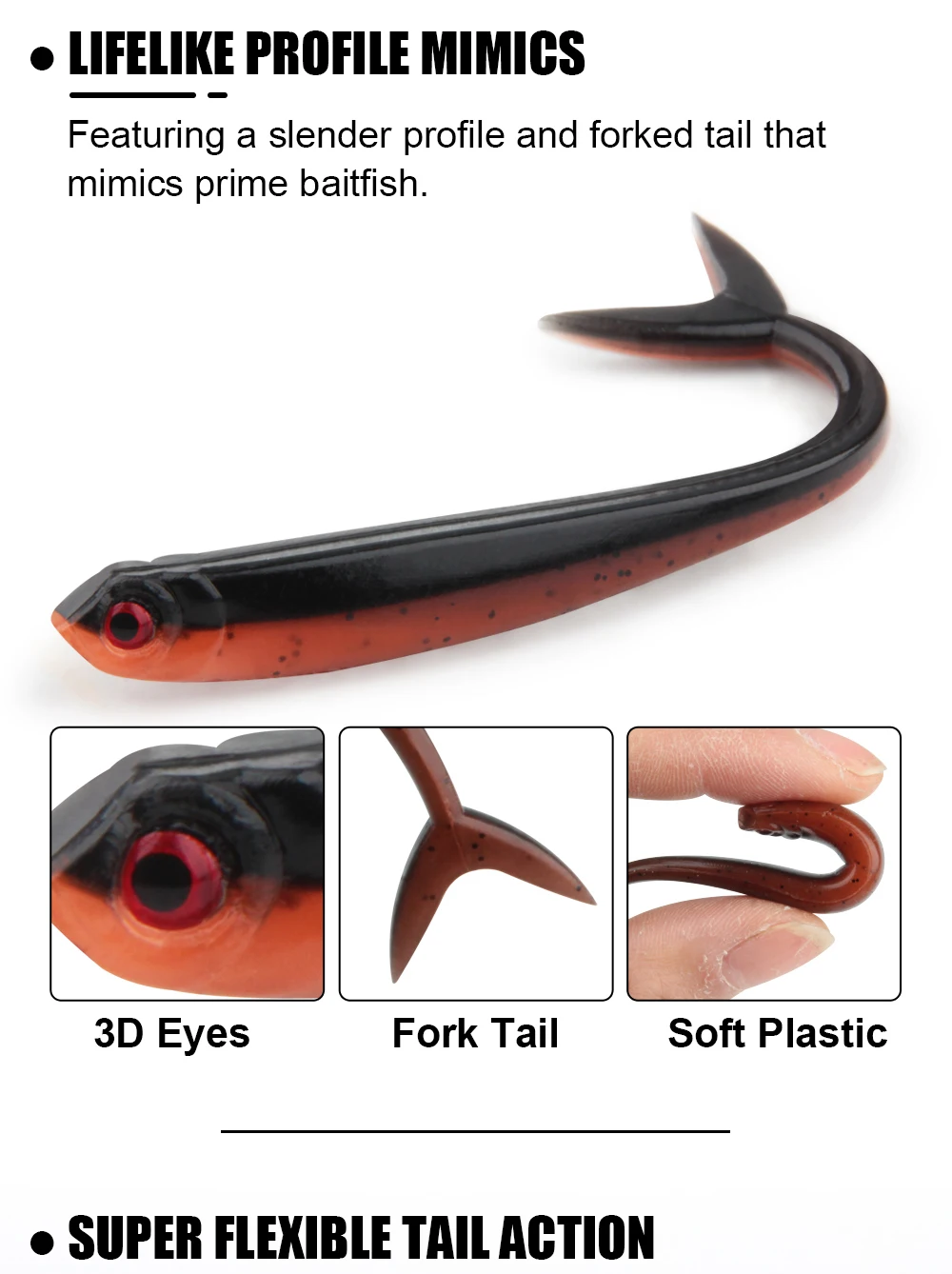 Spinpoler's 20pcs Soft Fishing Lure is ideal for rigging and jigging. Made from silicone PVC plastic, each lure measures 7.5cm in length and weighs 1.6g, making it highly responsive in the water. Its soft jerkbait fork tail design in bright colors provides great attractiveness and increase its chances of success.